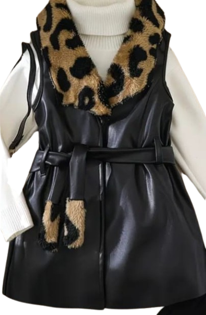 Tipo cuero brillante con cinturón, cuello de peluche, liviano.